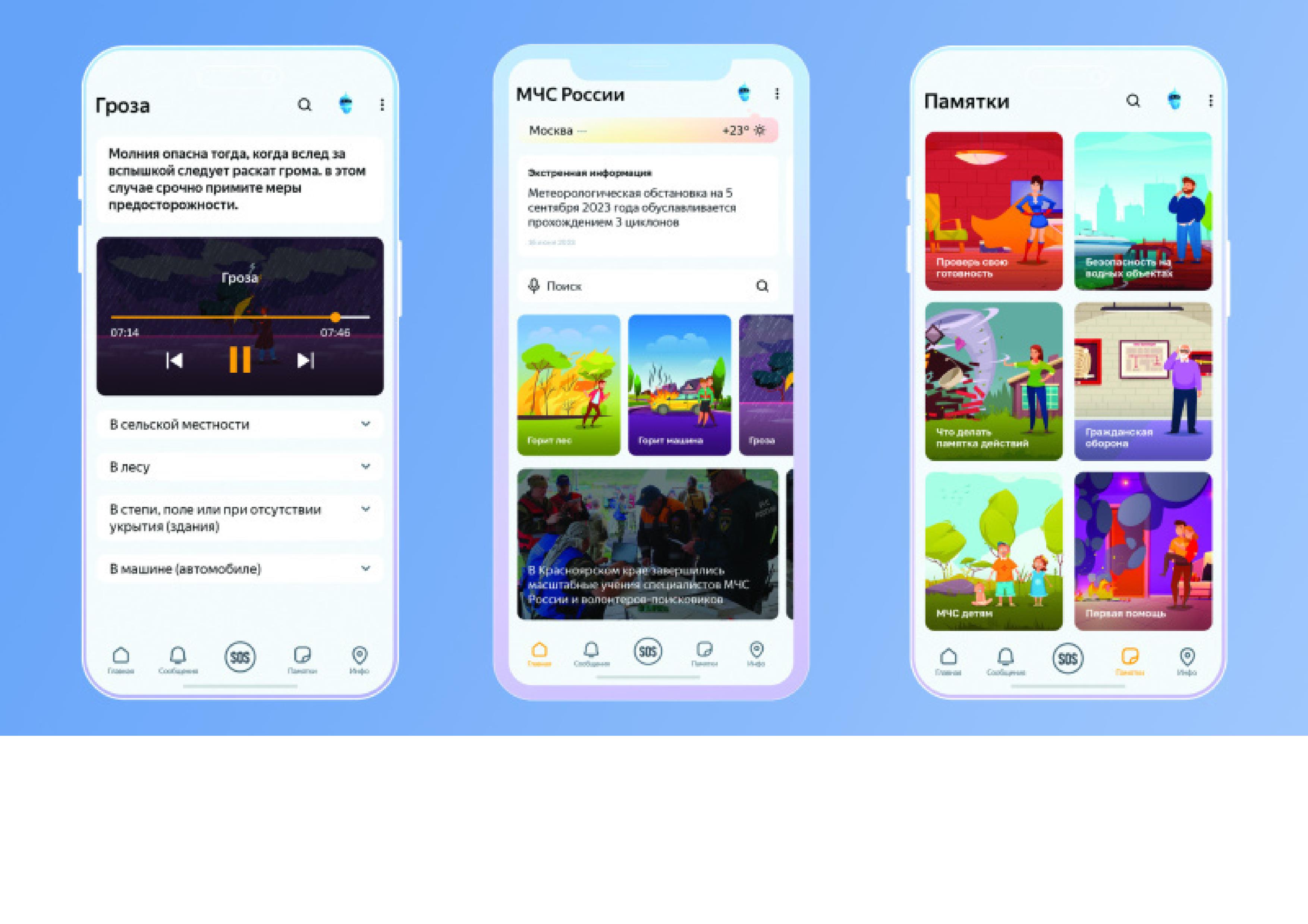 В разделе «Карта» доступен ежедневный оперативный прогноз о возможных угрозах и рисках природного и техногенного характера и реализована возможность определения координат своего местоположения, которые можно передать экстренным оперативным службам или близким.